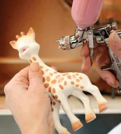 Farby stosowane do malowania gryzaka Żyrafy Sophie składają się w 100% z naturalnego kauczuku (takiego samego, jak stosowany do produkcji gryzaka Sophie) i naturalnych pigmentów. Po wymieszaniu tych dwóch materiałów przez pracownika tworzą one “farbę” spożywczą, która służy do ozdabiania Żyrafy Sophie.