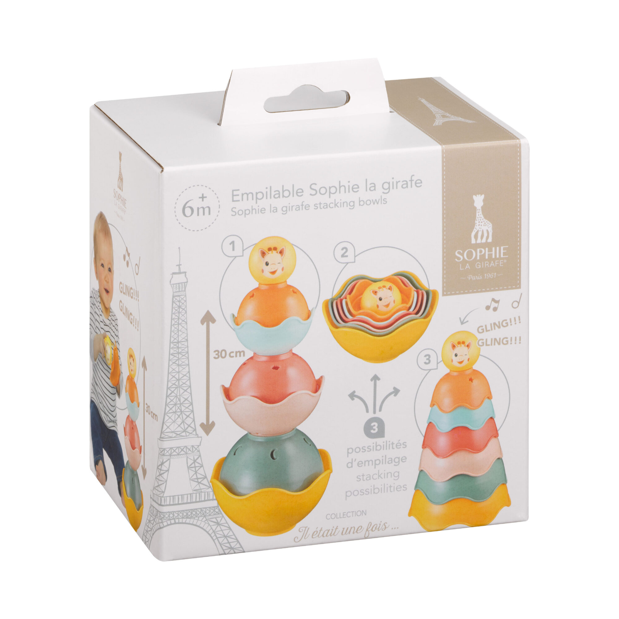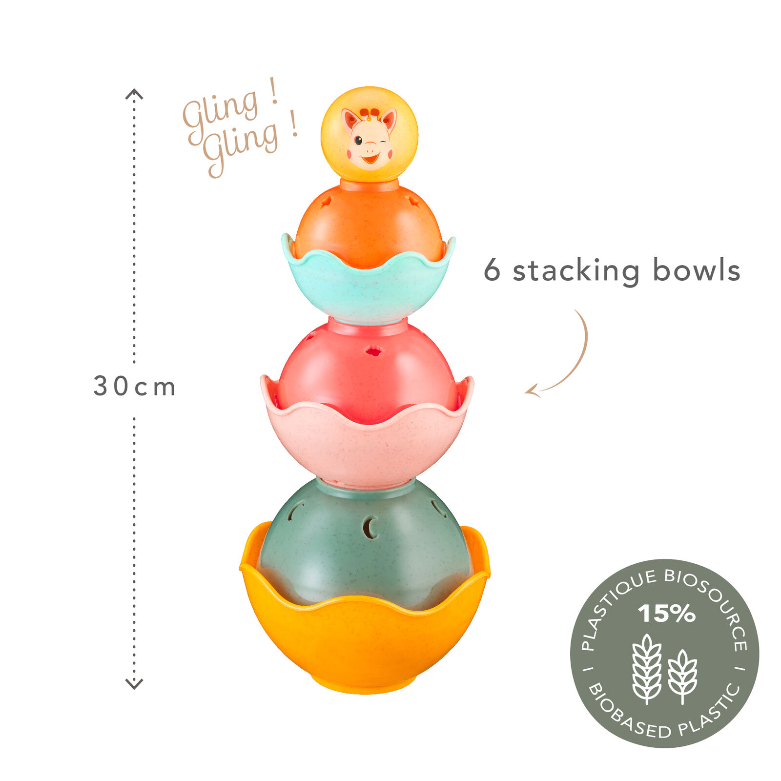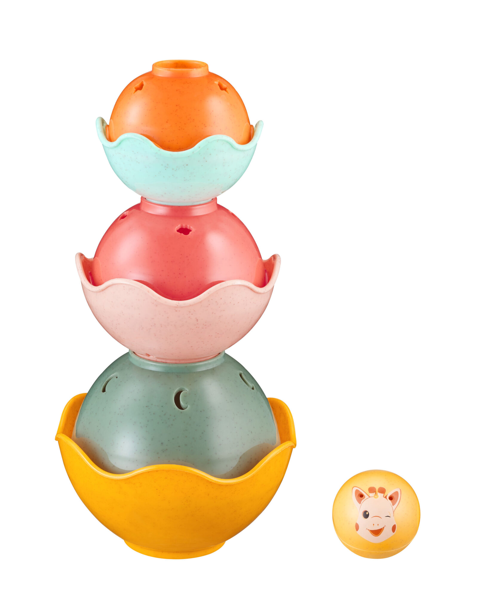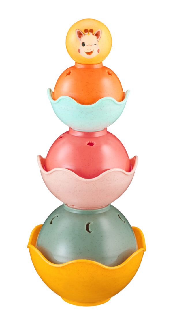 6 lekkich miseczek do układania pomaga w trenowaniu koordynacji i umiejętności motorycznych. Są lekkie i łatwe do chwytania przez małe paluszki. Dziecko uczy się budować piramidy a kolorowa kulka z uśmiechniętą buzią Sophie wydaje przyjemny i zabawny dźwięk. Na miseczkach znajdują sięróżne zwięrzeta i cyferki, które pozwalają budoowachstorie jednoczesnie ucząc malucha nowych nazw. W każdej miseczne znajdują się otworki przez kóre wylatuje nabierana woda. Daje to maluszkom wiele radości w kąpieli podczas ich napełniania i polewania się wodą. Trzy różne możliwości ułożenia piramidy pozwalają zrozumieć różnice między dużym i małym, wypukłym i wklęsłym oraz wysokim i niskim.
