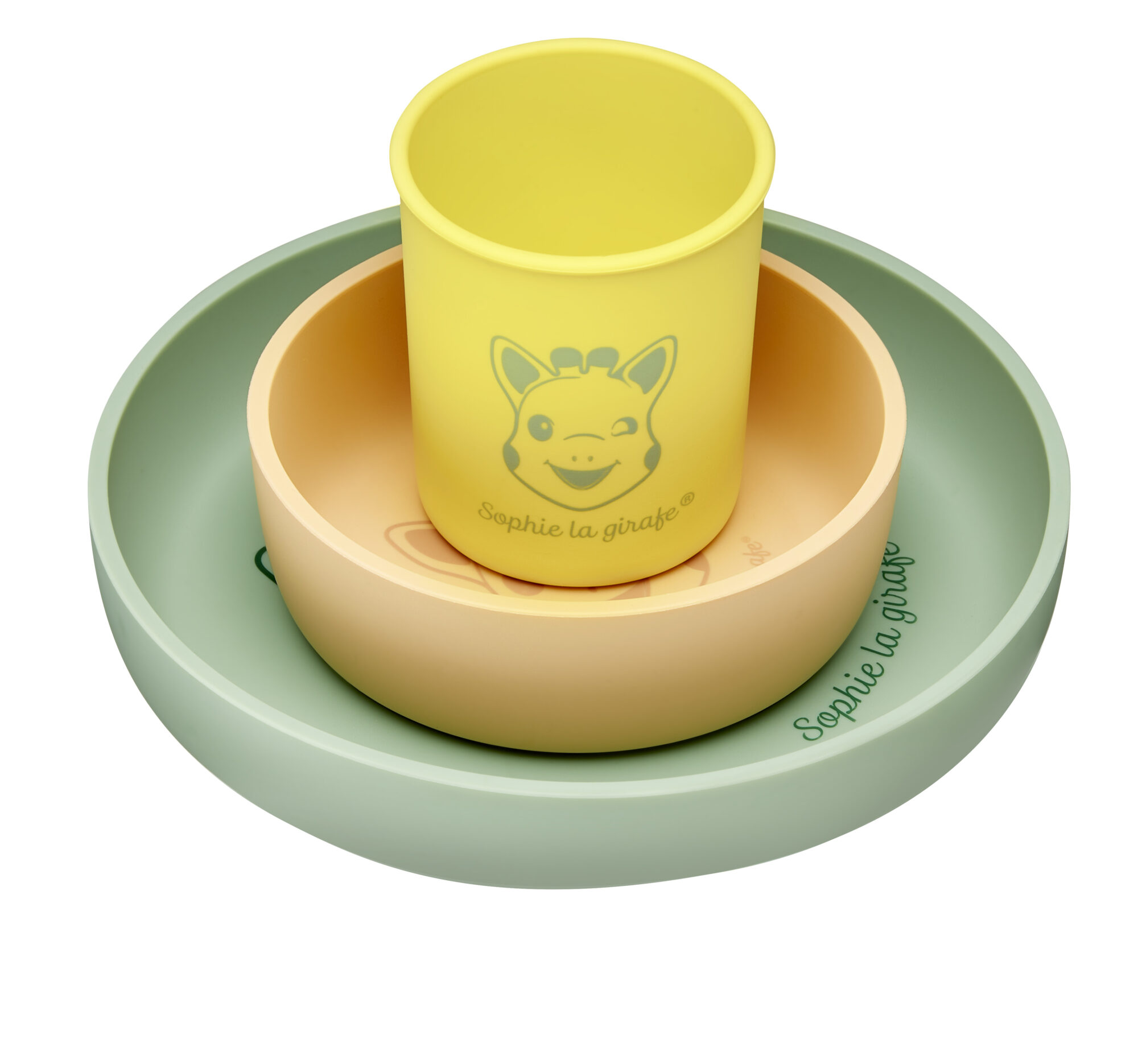 - Uśmiechnięta Żyrafa Sophie – każdy element zestawu ozdobiony jest sympatycznym wizerunkiem Żyrafy Sophie, co zachęca malucha do nauki samodzielnego jedzenia.