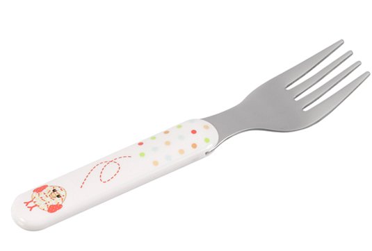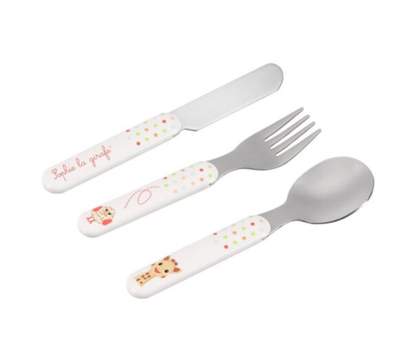 Trzyczęściowy komplet sztućców jak dla dorosłych, z metalową częścią wkładaną do ust. Łyżka, widelec i nóż. Ergonomiczne i zaokrąglone kształty dla bezpieczeństwa malucha.