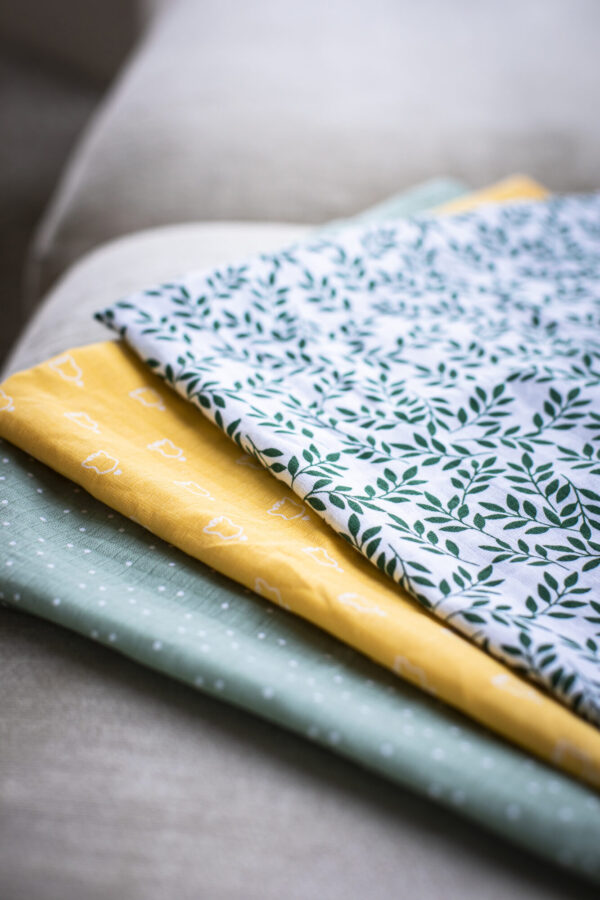 - Zielona pieluszka w odcieniu szałwii z białymi kropkami
