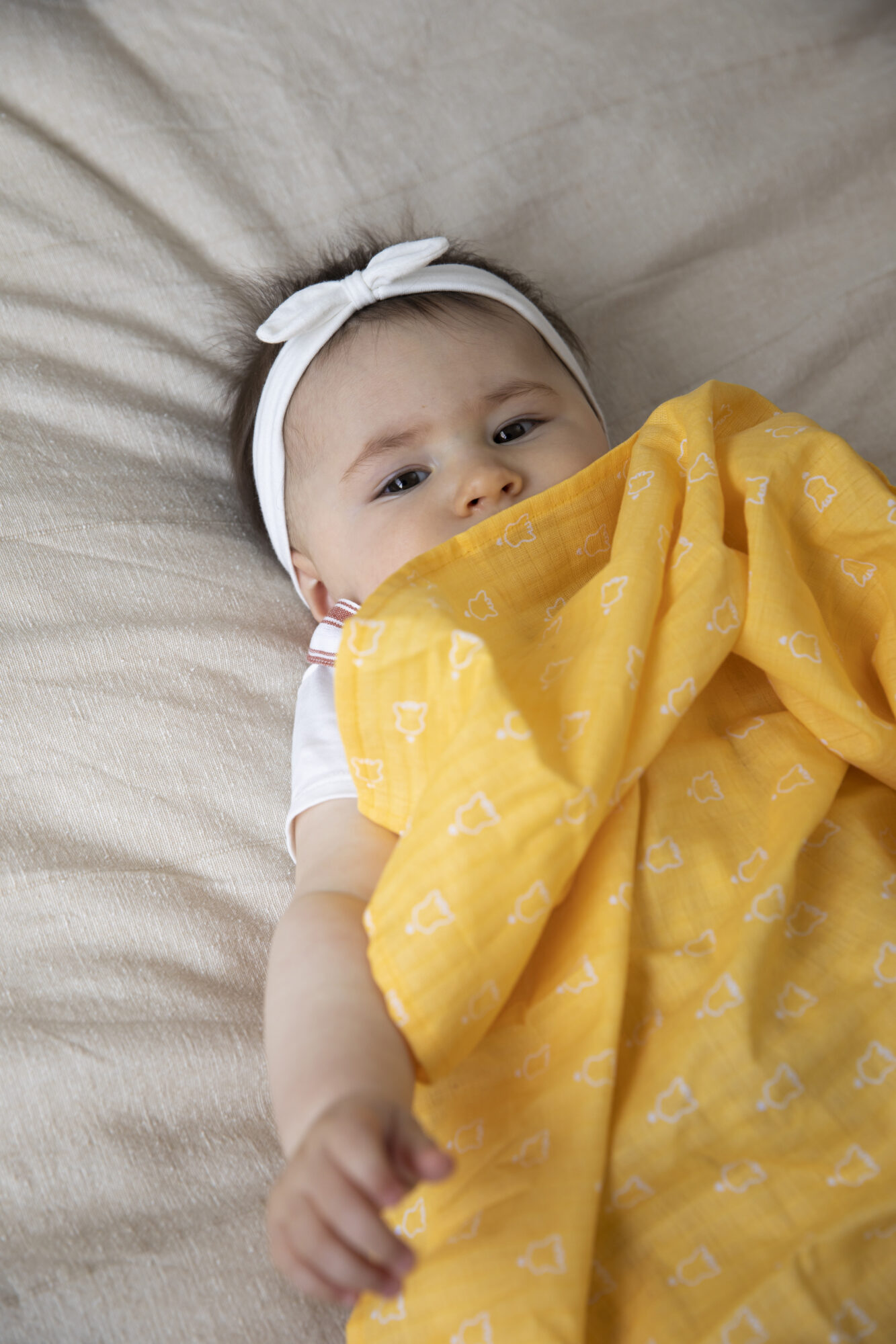 - Złotożółta pieluszka z białym nadrukiem głowy Żyrafy Sophie i serduszka
