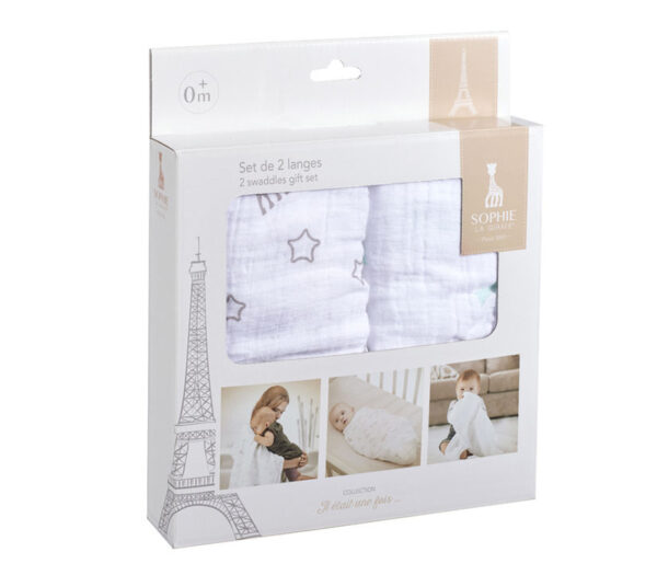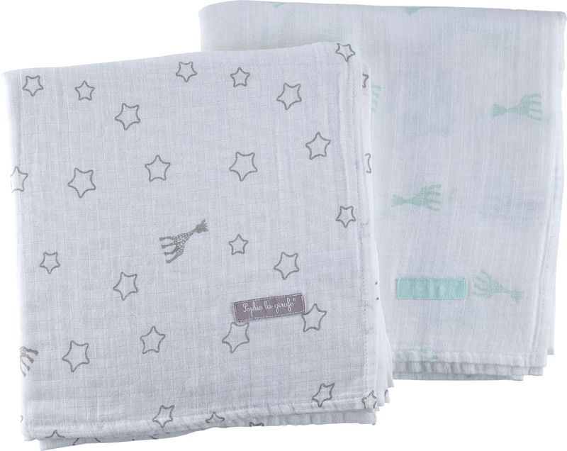 Dwie duże muślinowe pieluchy o wymiarach 120 cm x 120 cm. z delikatnym wzorkiem w kształcie Żyrafy Sophie. Niezbędne w codziennym życiu z maluszkiem. Mogą być wykorzystywane na wiele różnych sposobów: jako kocyk, przykrycie do wózka, osłona przed słońcem, śliniak, podkładka do zmiany pieluchy, itp. Zostają niezastąpionymi przytulaczkami, bez których maluszek często nie może usnąć.