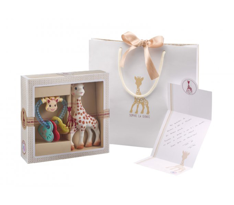 Zestaw narodzinowy dla niemowląt – Gryzak Żyrafa Sophie i grzechotka w eleganckim opakowaniu